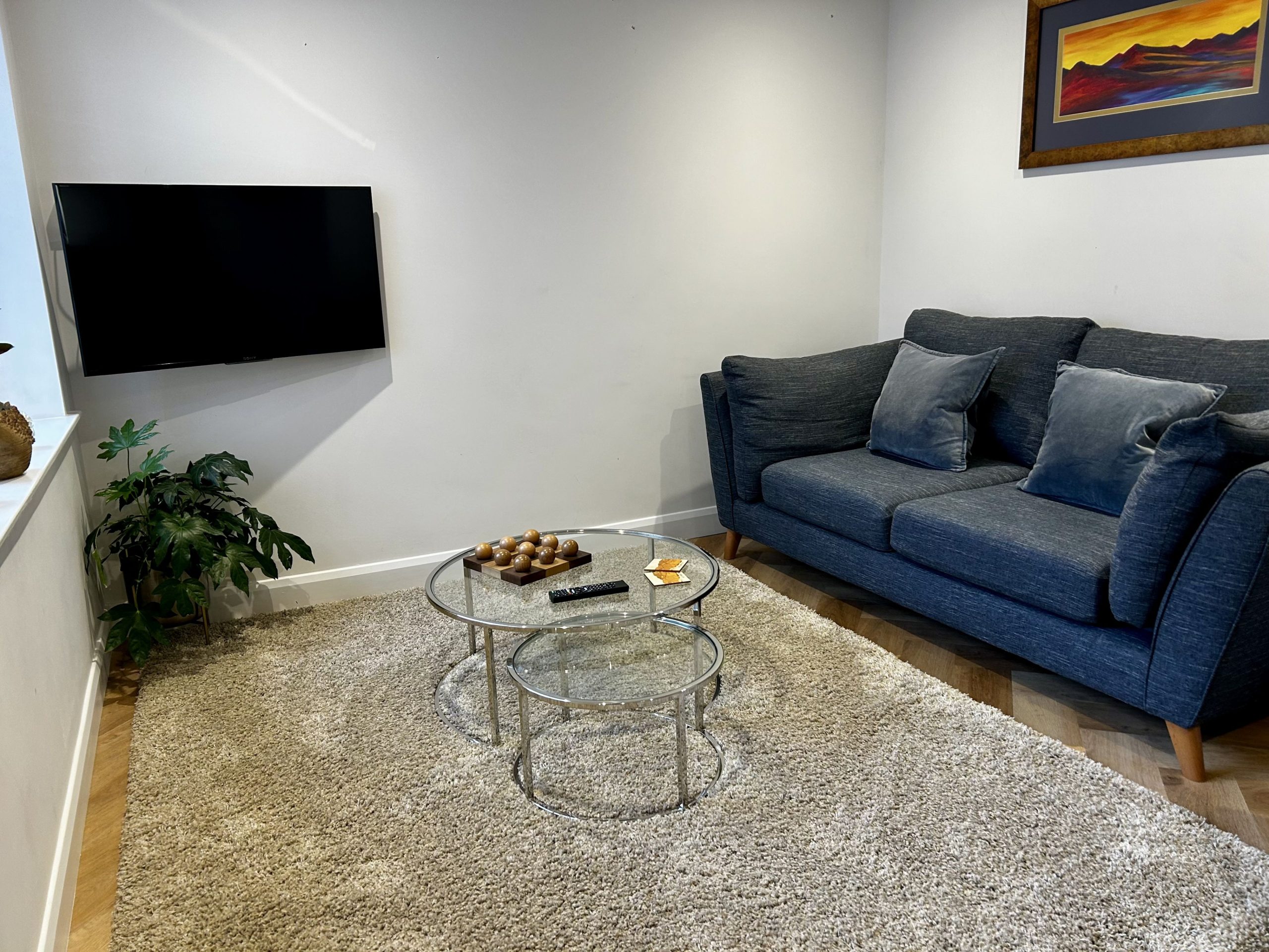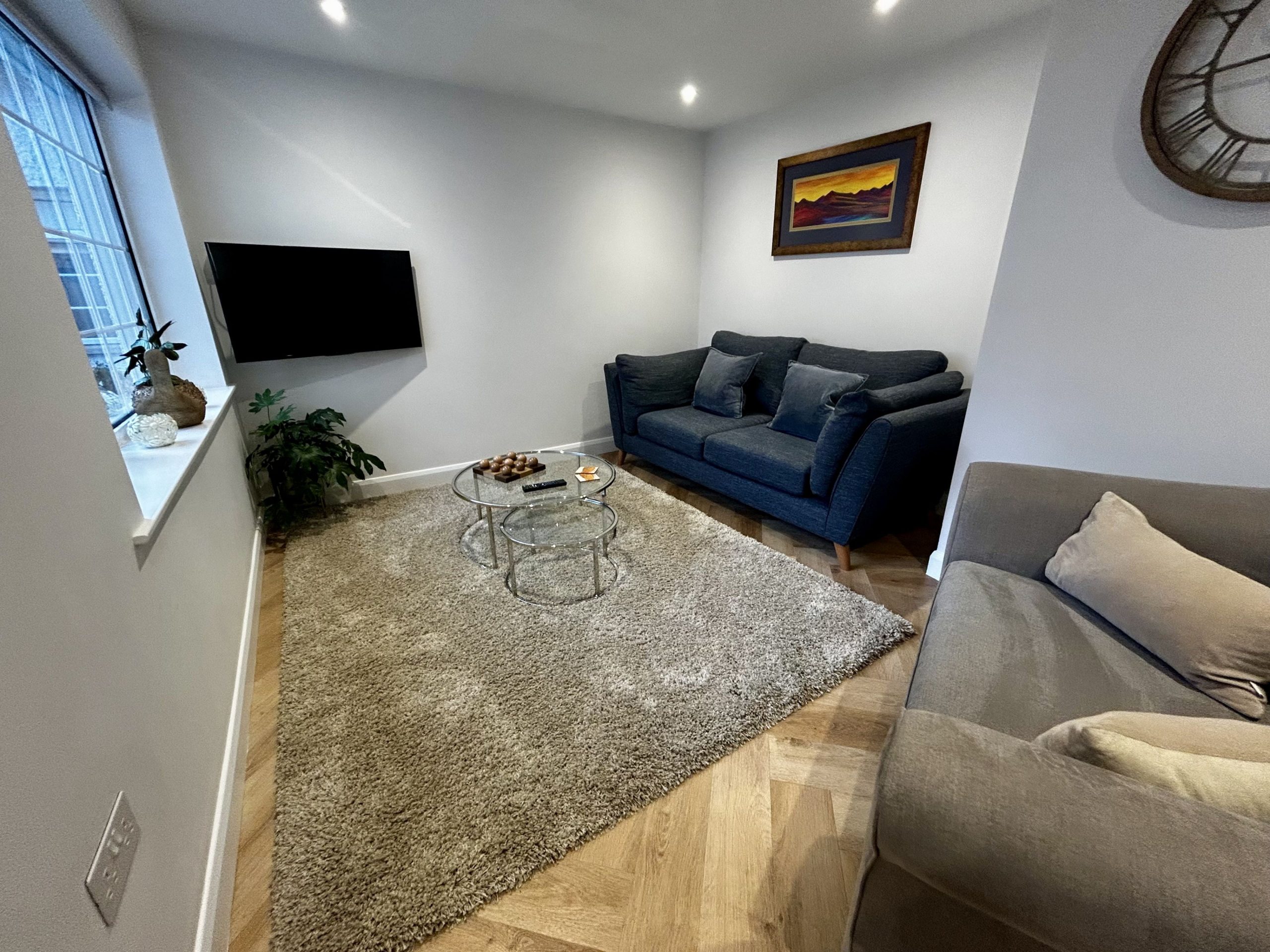 The kitchen is very well-equipped with quality worktops, appliances and cookware. There is an electric oven & hob, dishwasher, fridge with ice box, and microwave. There is a bespoke dining table and chairs, comfortable lounge seating, and a wall-mounted smart TV.