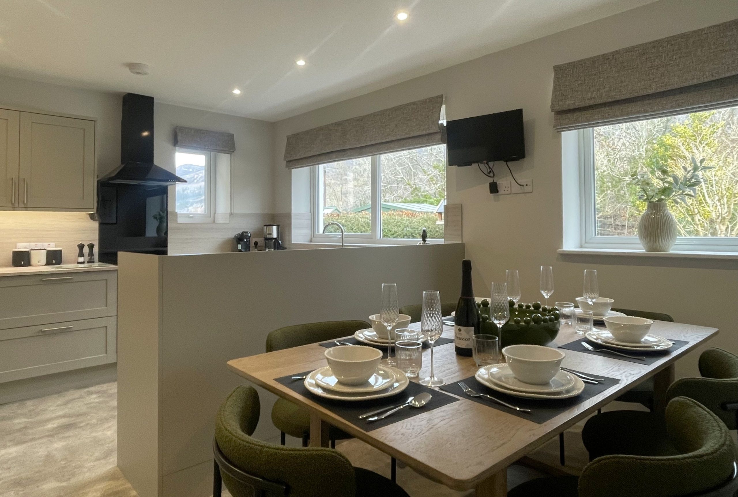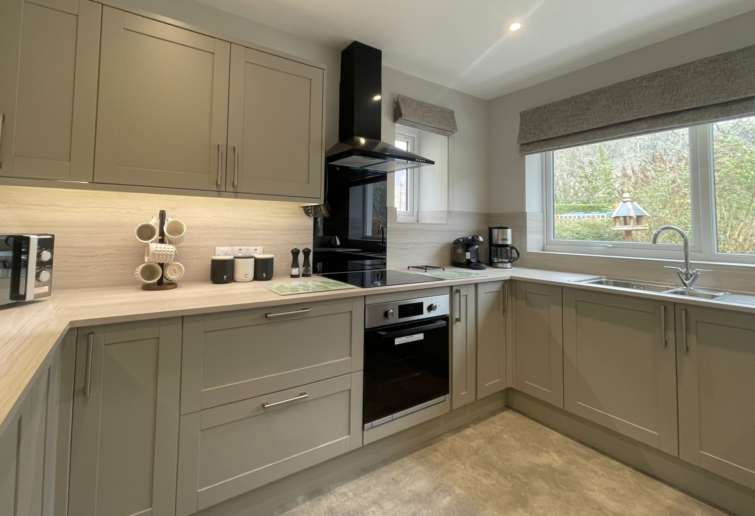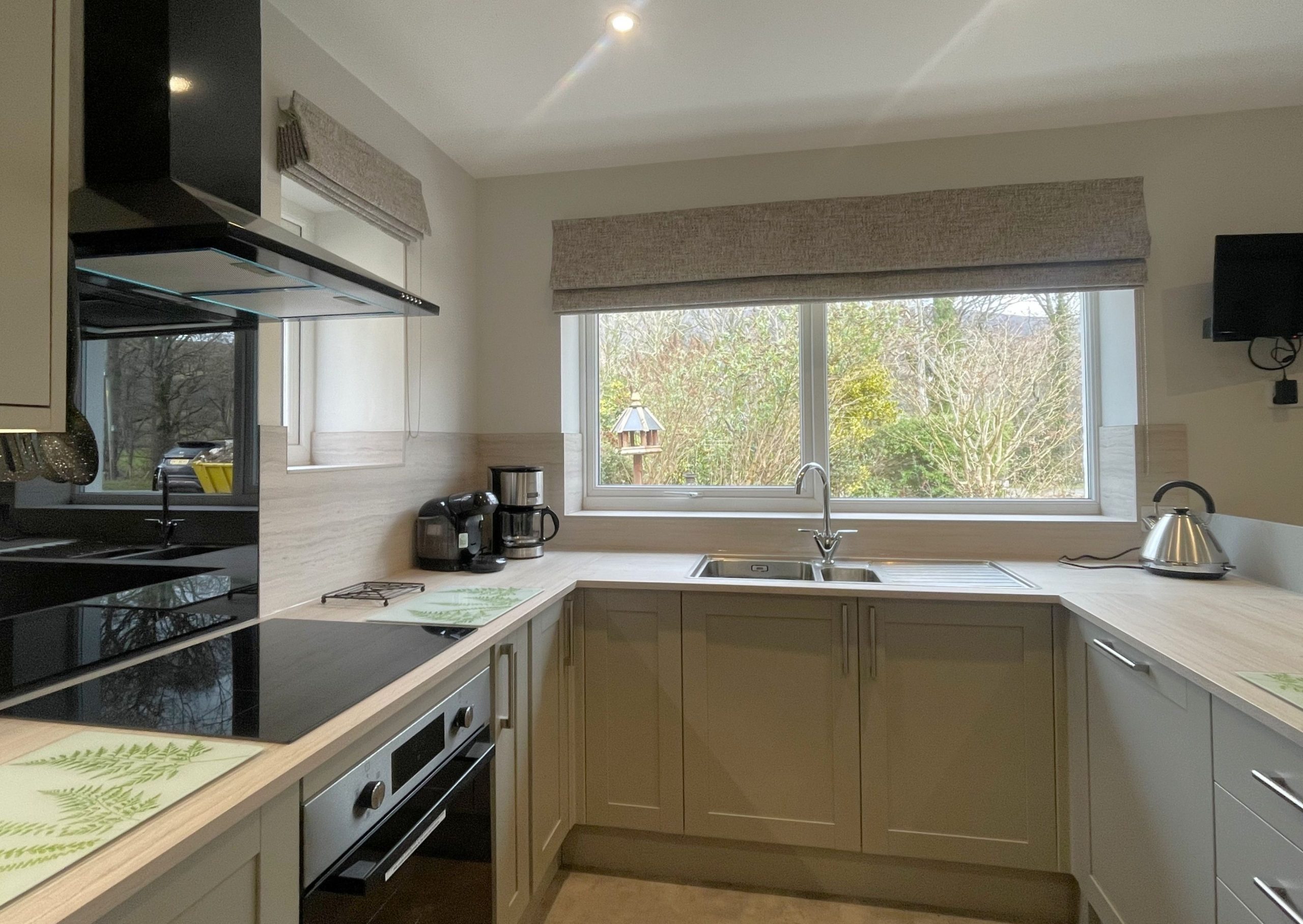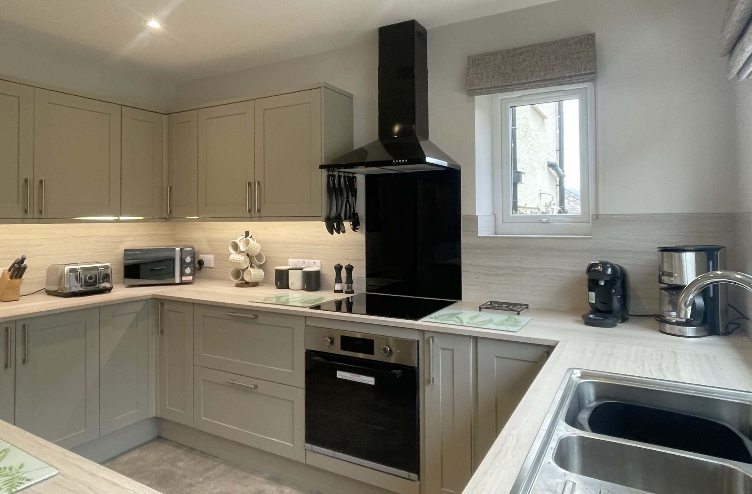 To the right of the hallway is the large, modern kitchen with a dining table that comfortably seats six people. In the kitchen, you’ll find everything you need to enjoy your self-catering break, with the added bonus of panoramic fell views. You don’t get those at home! The kitchen has a free-standing fridge-freezer, oven, induction hob, microwave, kettle and toaster. For added convenience, there is also a dishwasher and Tassimo pod coffee machine.