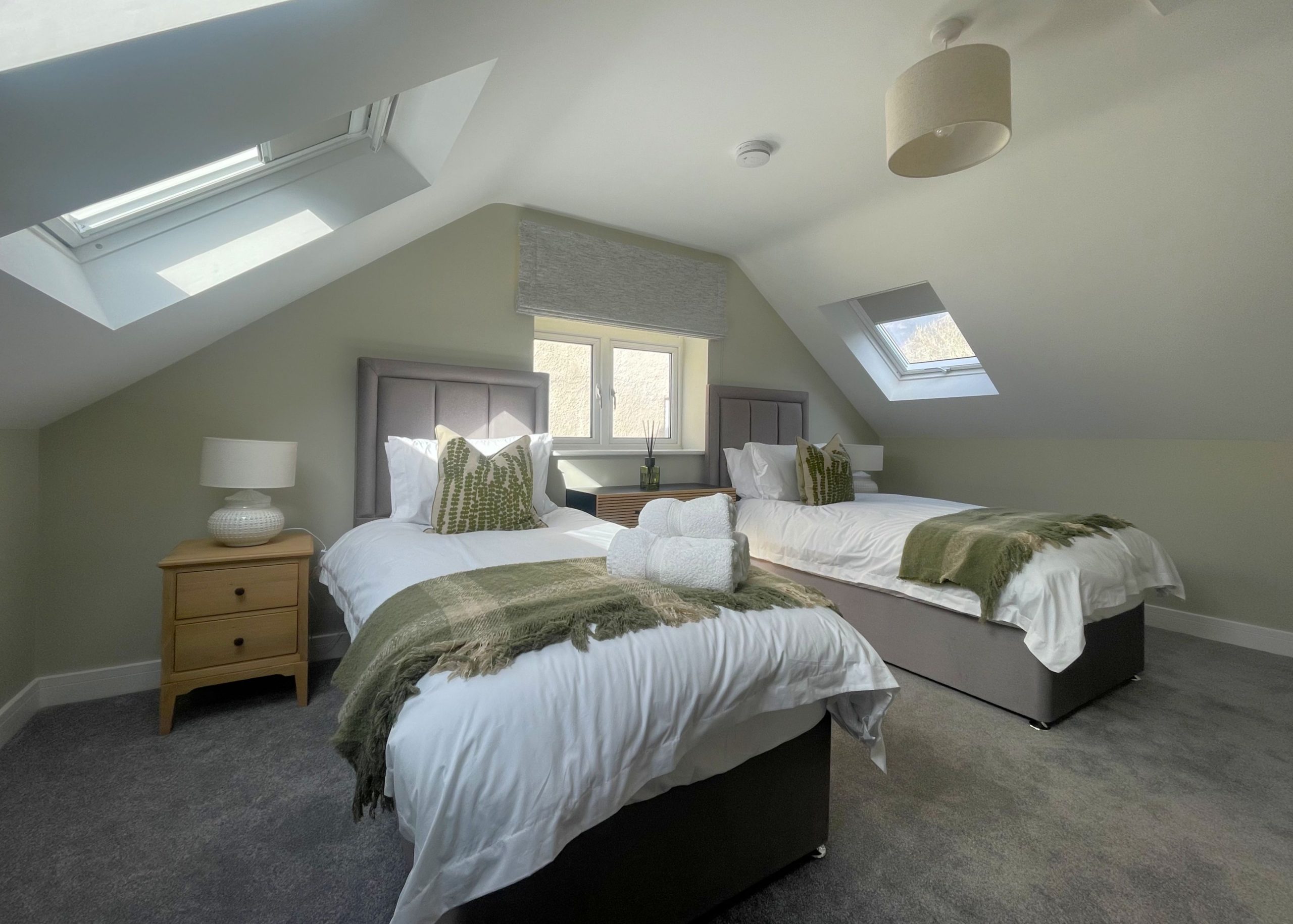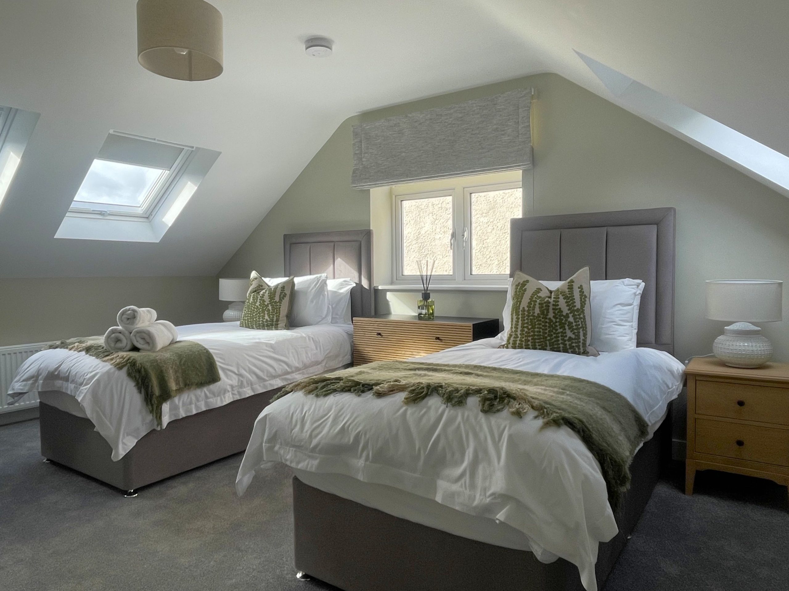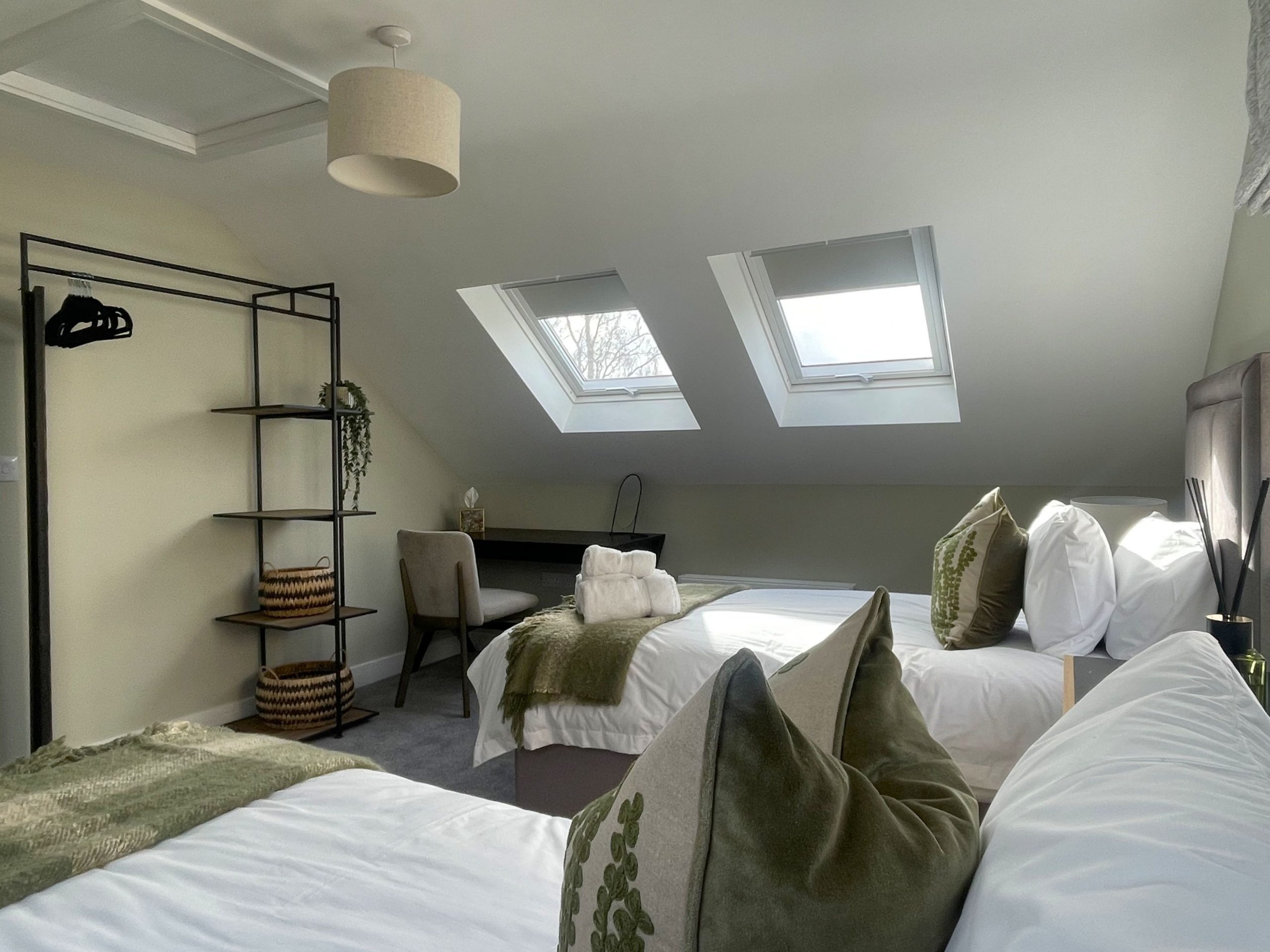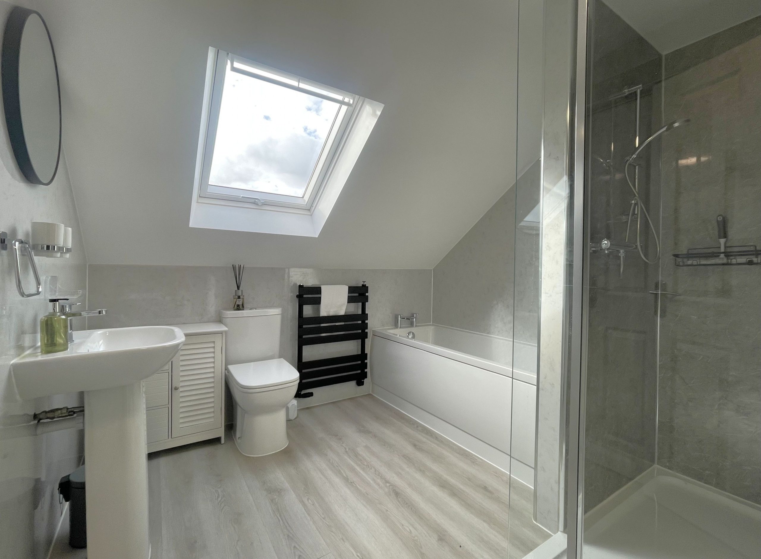 Moving upstairs, we have the twin bedroom, complete with wardrobe, dressing table, seat and large Velux windows. Down the hall is the family bathroom with bath, separate shower, WC and sink.