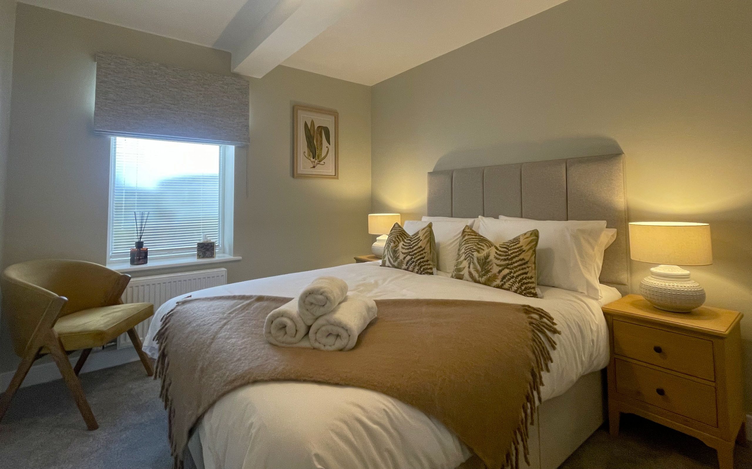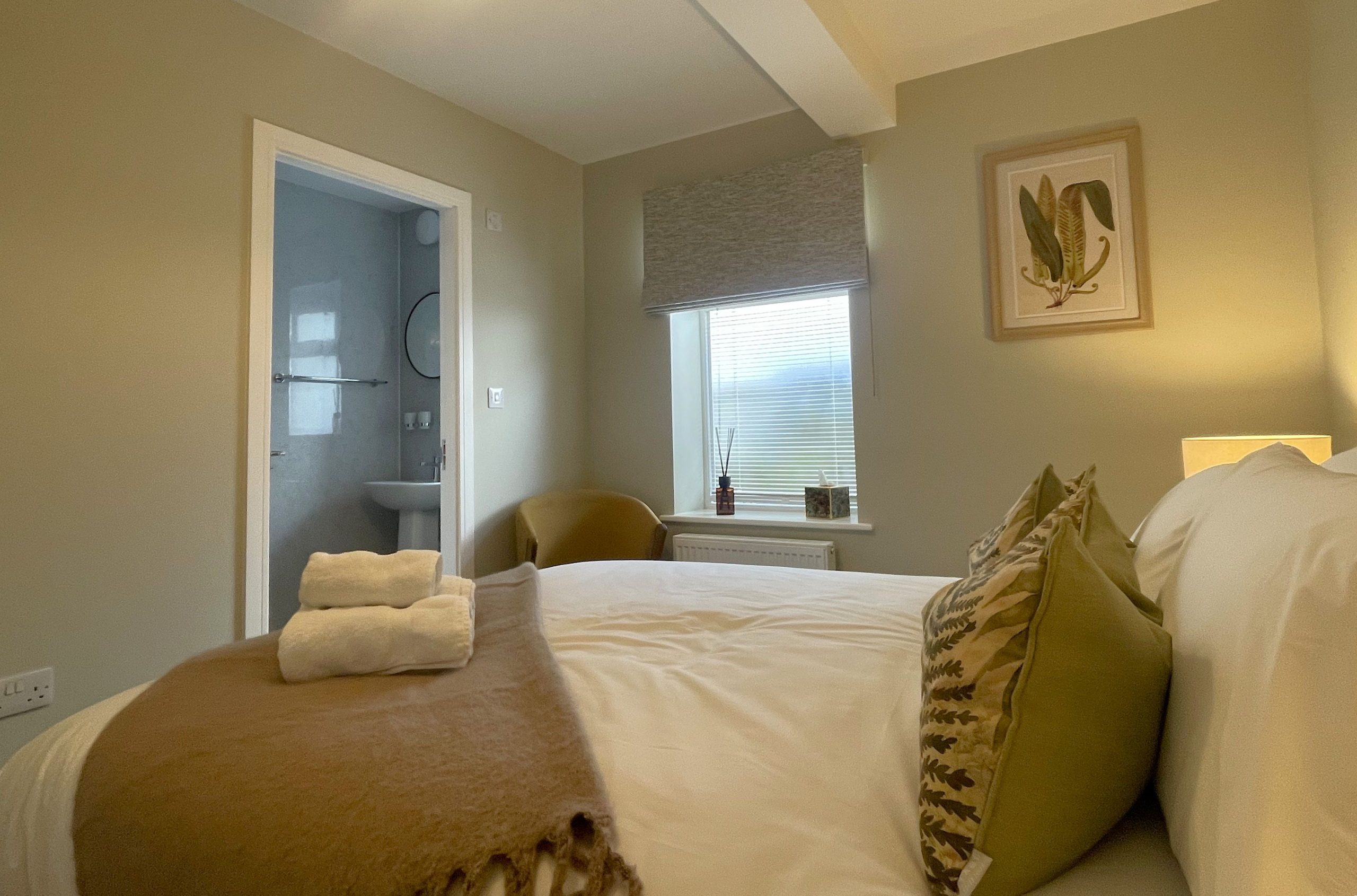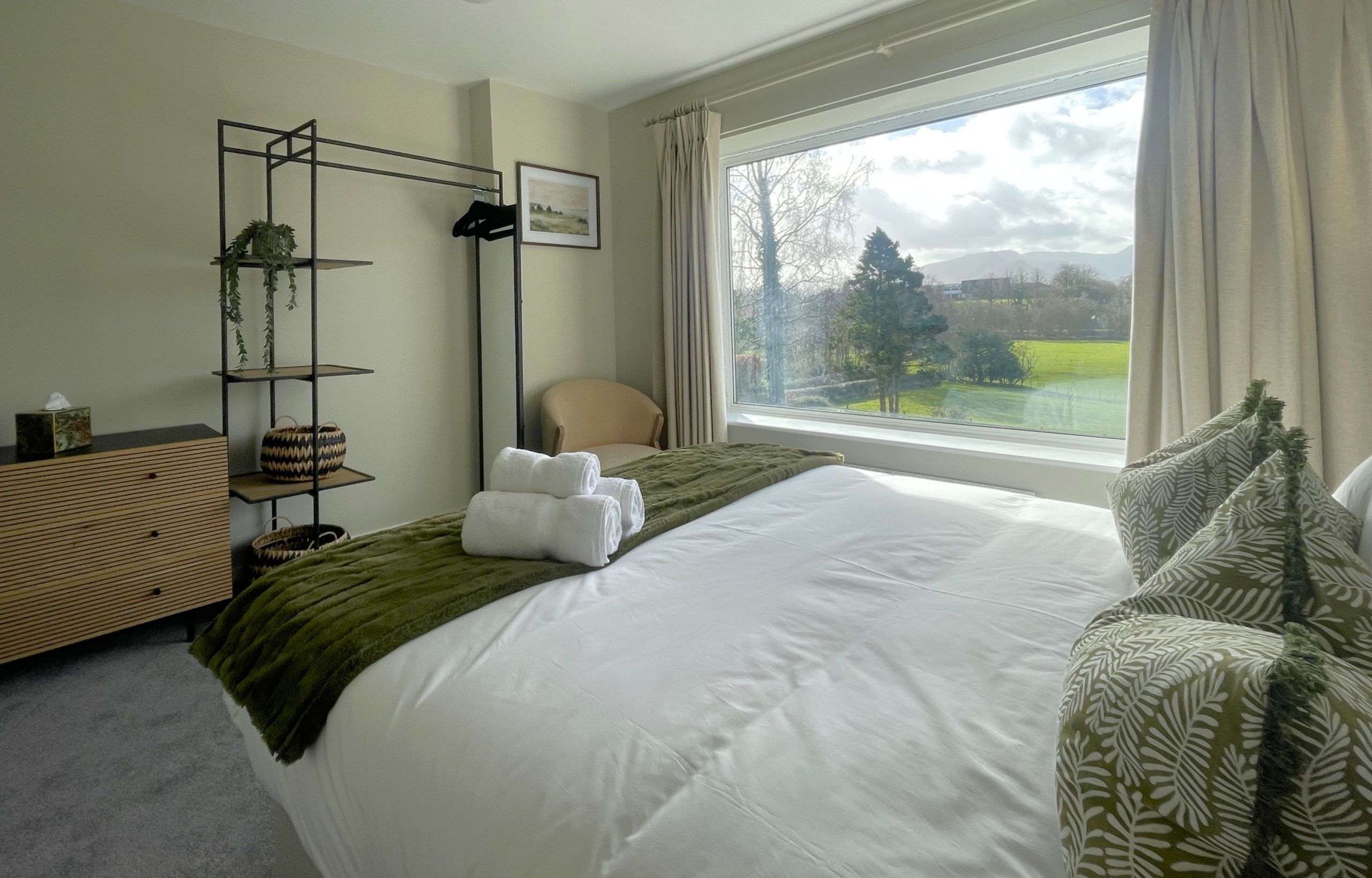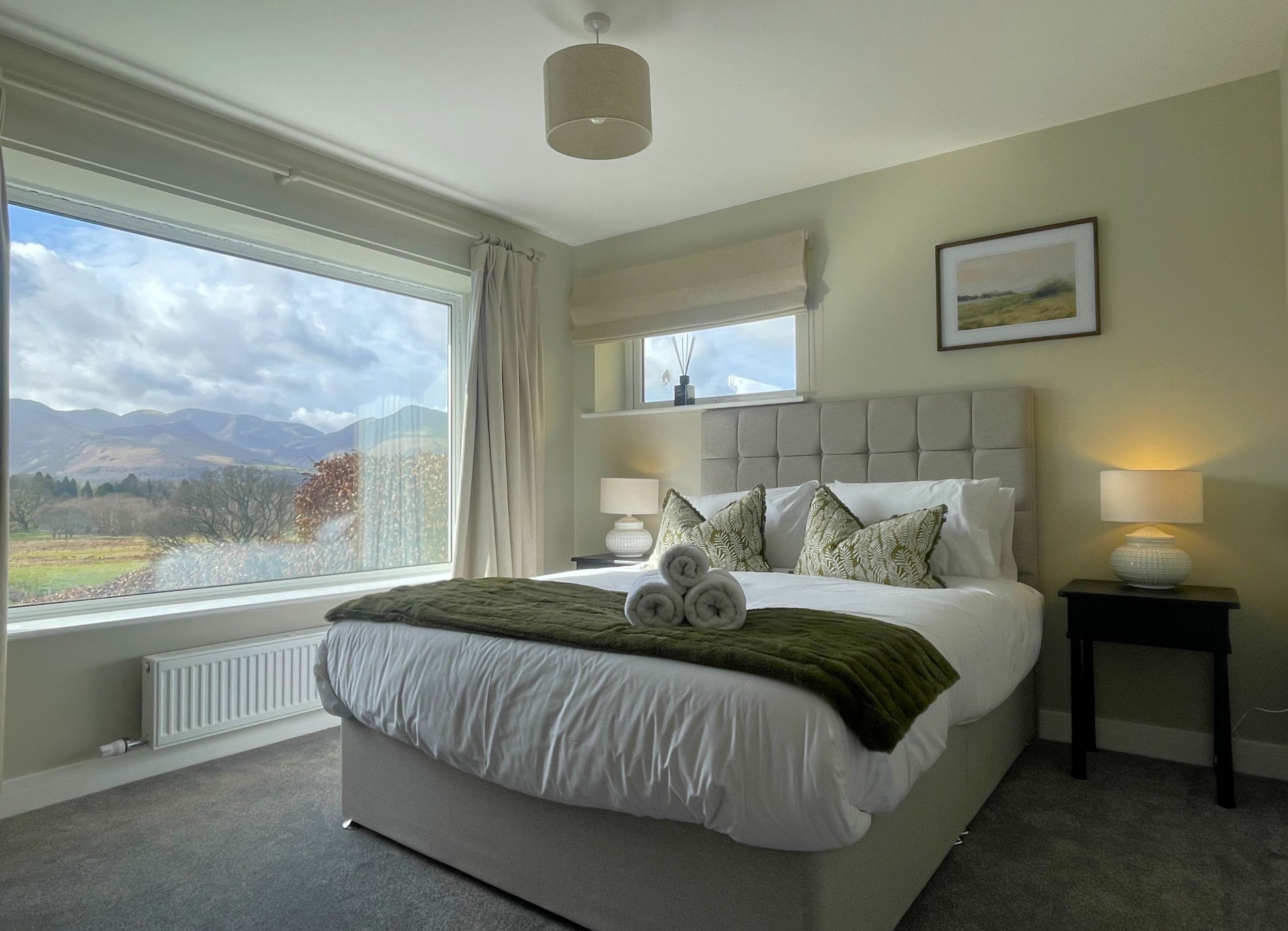 There are two bedrooms downstairs. Both are king rooms with en-suite shower rooms comprising of WC, sink, shower, and heated towel rails. Both bedrooms have ample storage, and the main bedroom has views across the fields and over to the fells. Not a view you wake up to every morning, but you certainly can at Easedale!