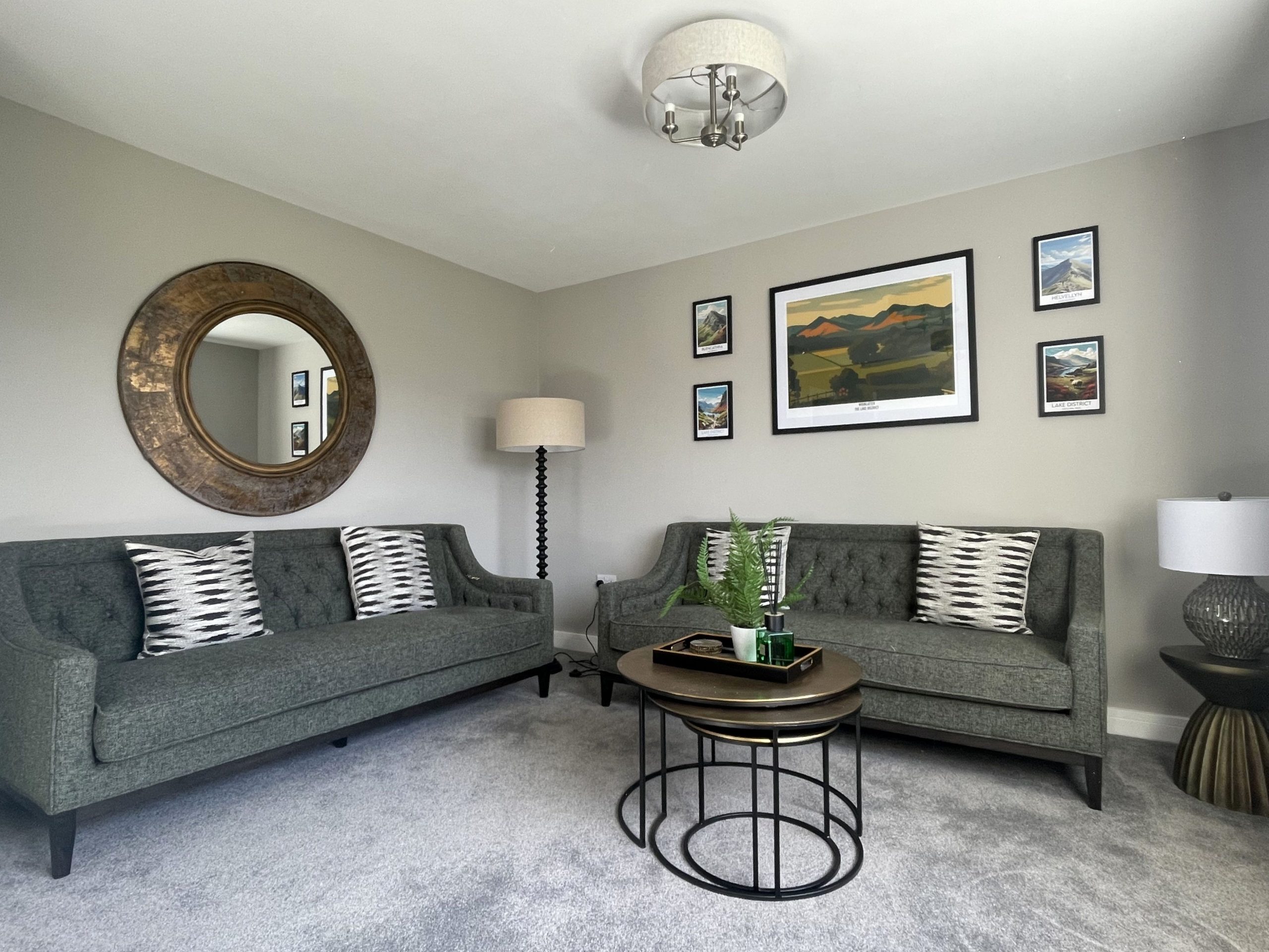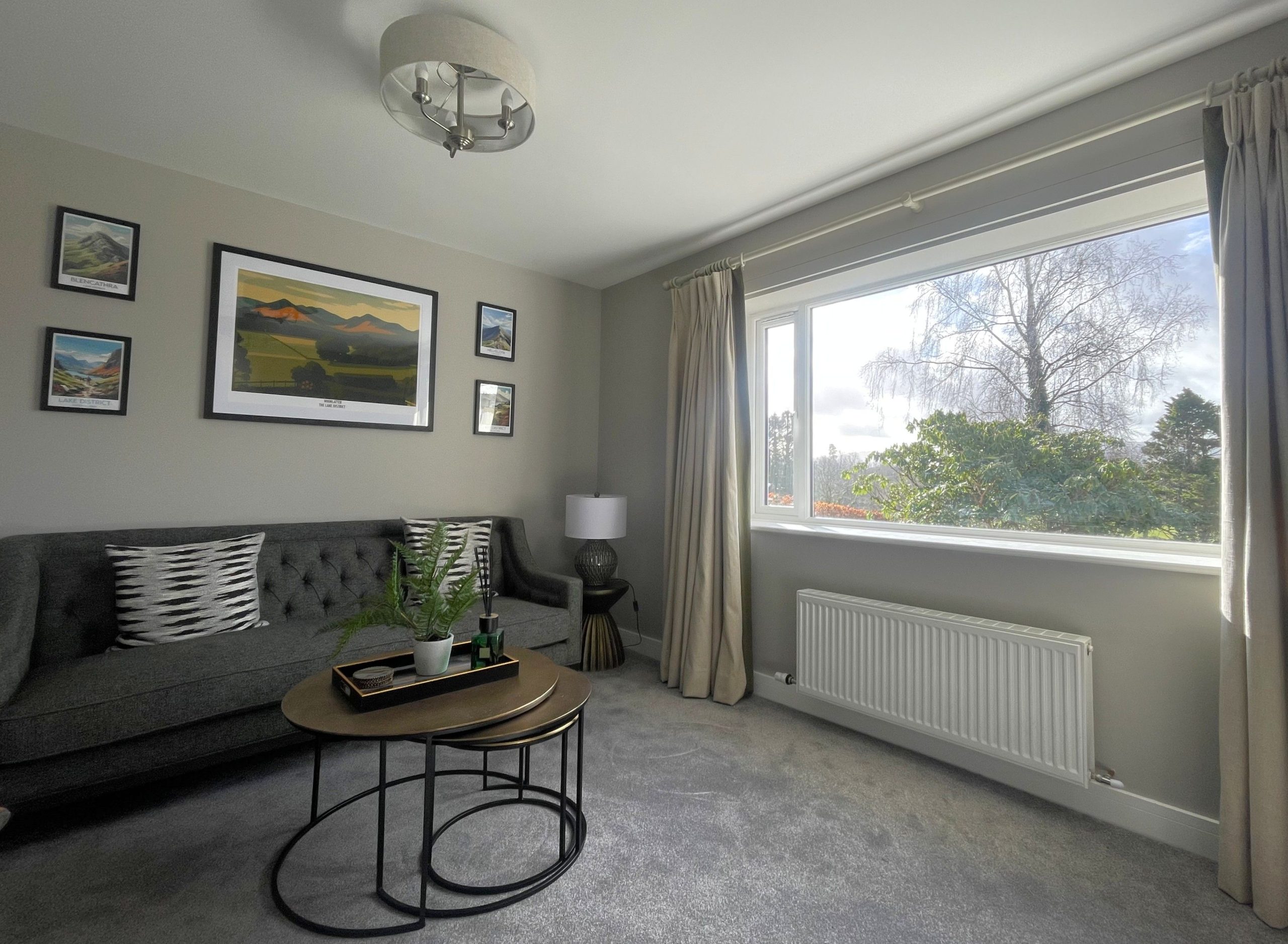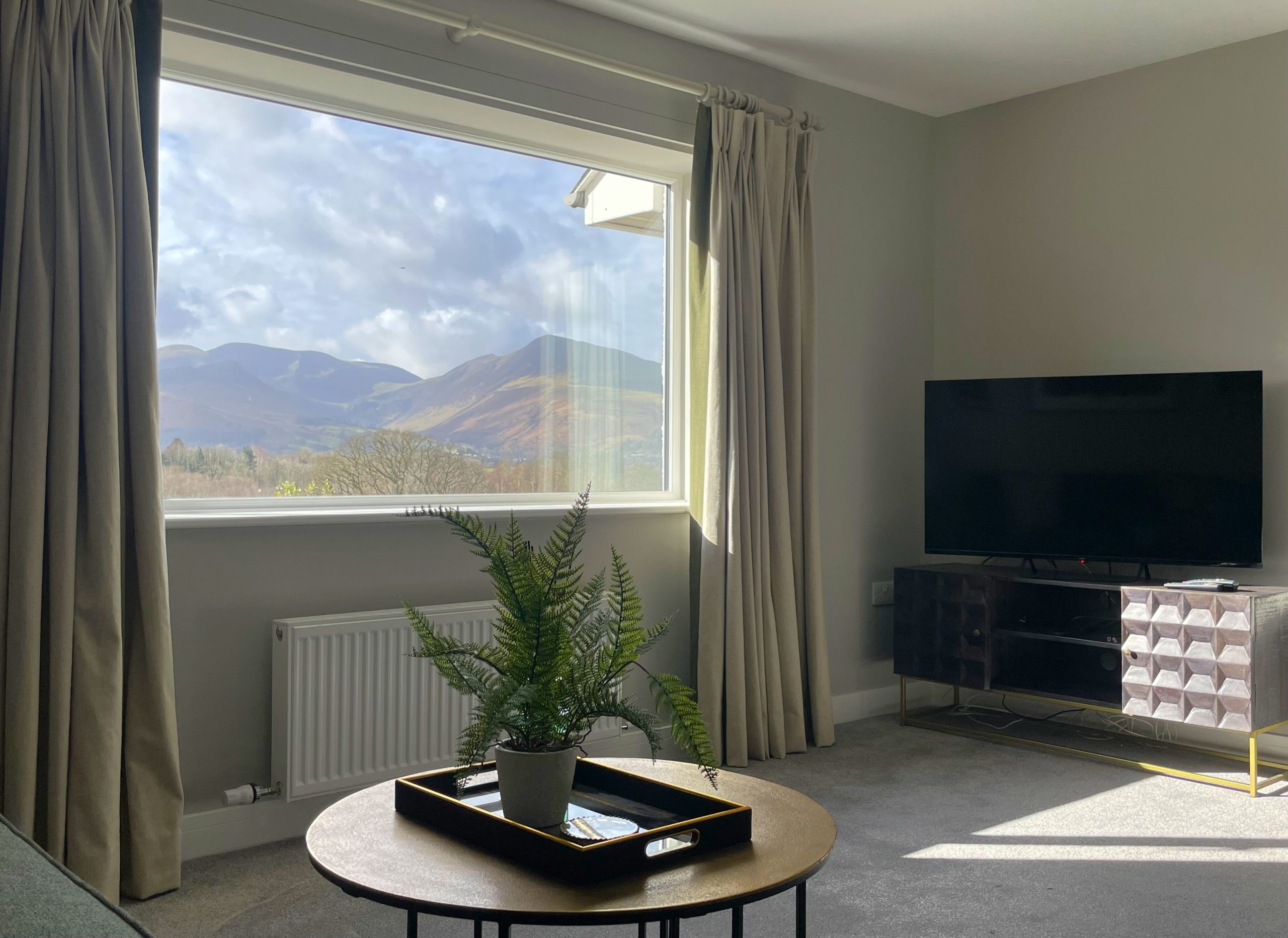 At the end of the hallway, there is a large, comfortable living room with stylish sofas and a Smart TV. This is the perfect space to relax after a day exploring the Lake District.
