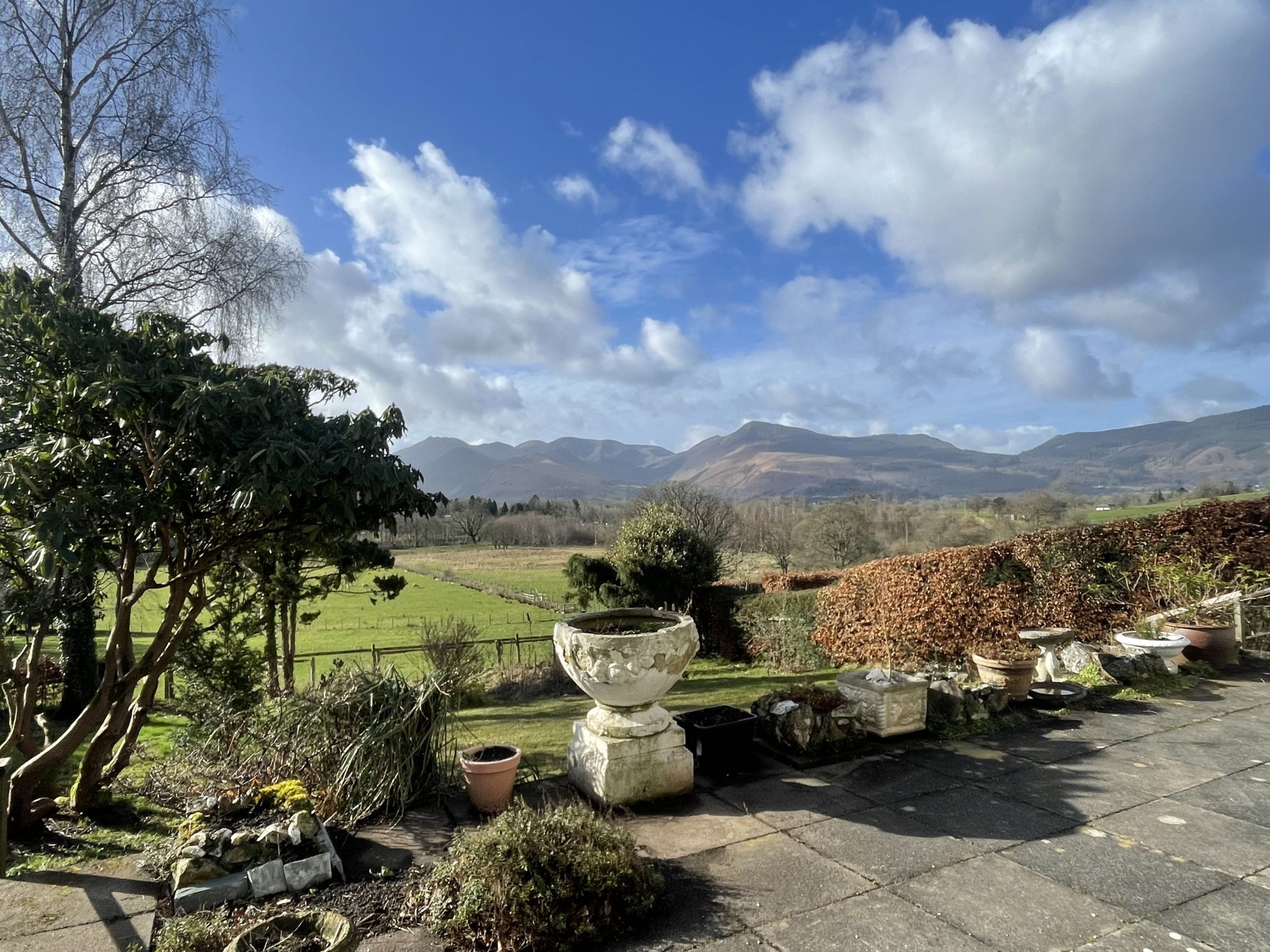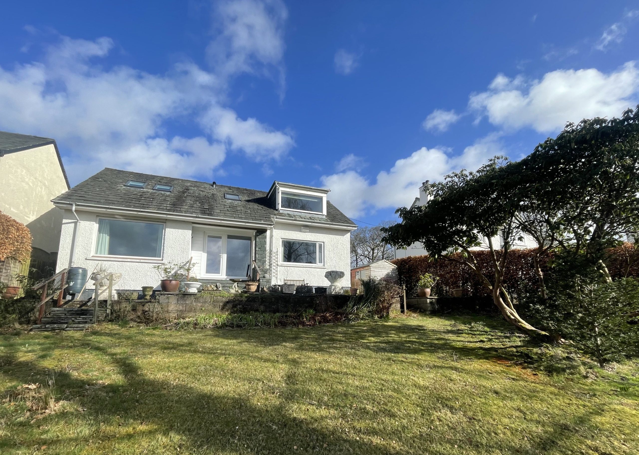 To the rear of the property is a large, split-level garden. The upper level is paved, with seating and steps down to the lawned area. Why not enjoy a glass of wine (or two, or three…) while enjoying the views?