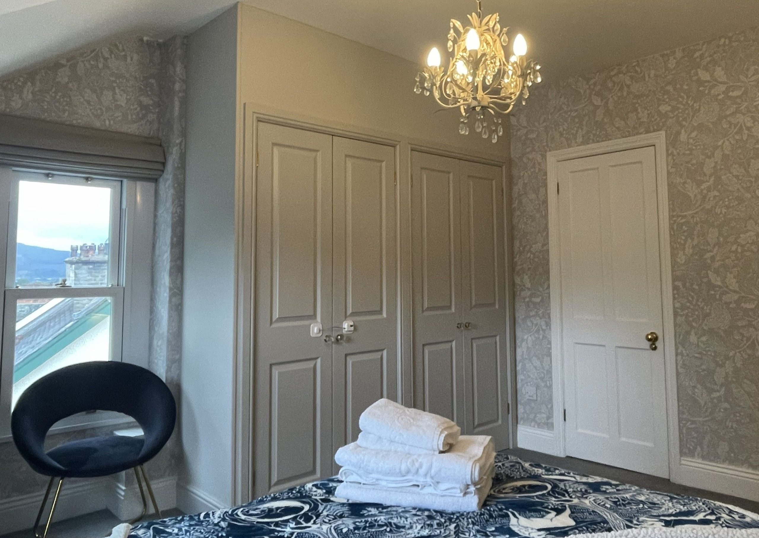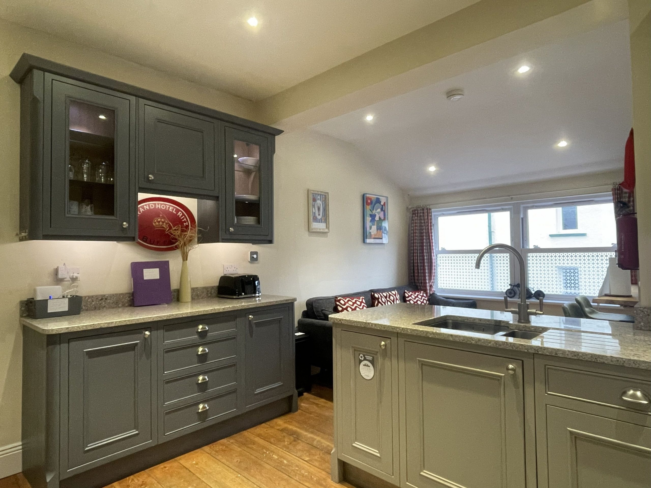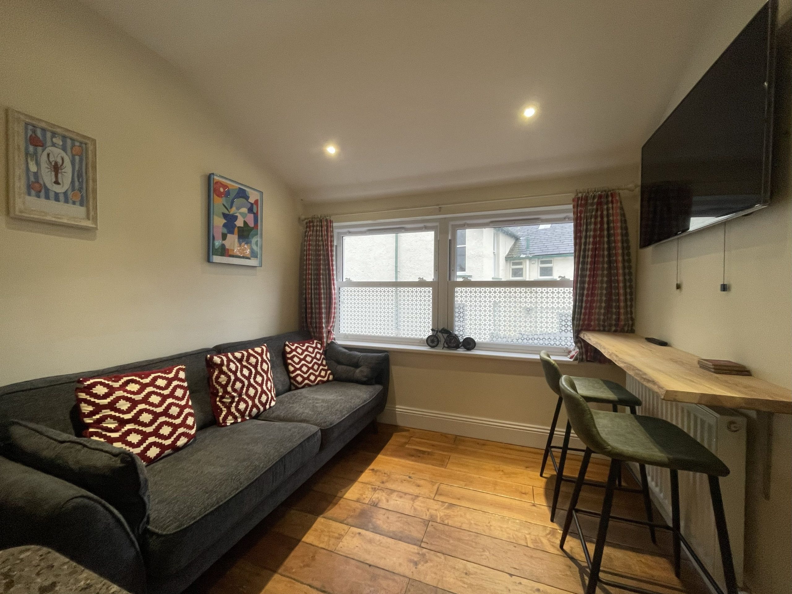 The well-equipped modern kitchen has everything you need for your self-catering holiday in Keswick. There is a large fridge-freezer, dishwasher, built in microwave and double oven and gas hob. There is also a breakfast bar, small sofa and a TV in the kitchen area. Leading on from the kitchen, towards the rear of the property, there is a traditional airer on a pulley system and a downstairs WC. The cupboard in the gym houses a sink and the washing machine and tumble dryer.